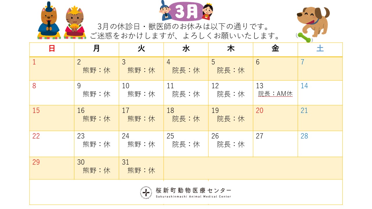 3月の獣医師勤務表は以下の通りです。